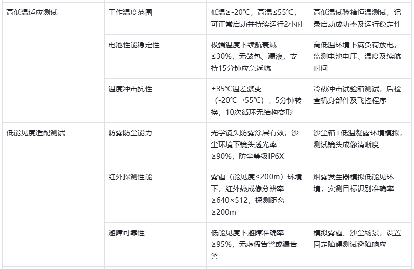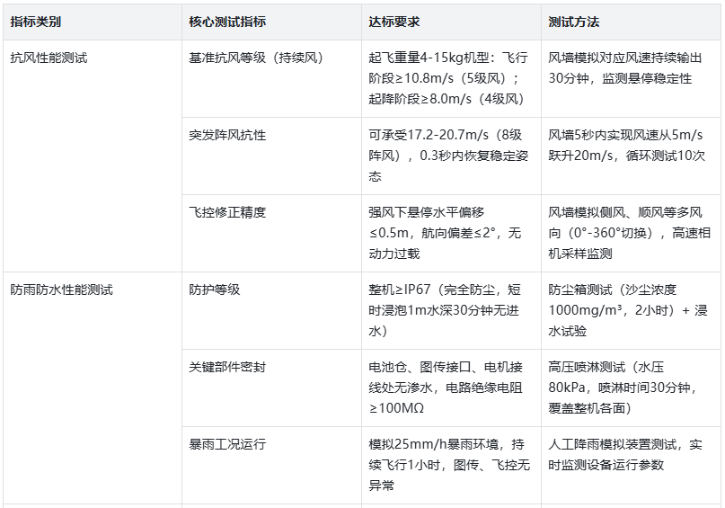 本清單基于《GB/T 38930-2020 民用輕小型無人機系統抗風性要求及試驗方法》《GB/T 38997-2020 無人機系統 環境試驗方法》及交警交通監測、事故勘察等實際場景需求制定,核心聚焦強風、暴雨、高低溫、低能見度等典型惡劣天氣適配性。